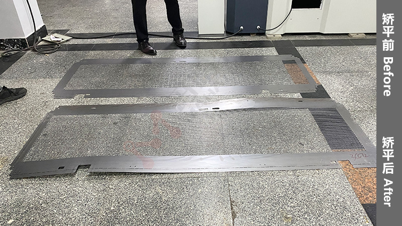 瑪哈特校平機(jī)的矯平技術(shù)能使能使金屬材料的各個(gè)部分有選擇地伸展,在材料屈服點(diǎn)以下,將板材中纖維較短的部分按比例拉伸,得到均勻的纖維長(zhǎng)度,提升網(wǎng)板的質(zhì)量的同時(shí),不會(huì)改變網(wǎng)板的厚度。